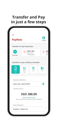 Obavljajte plaćanja i prijenose bilo kada i bilo gdje s lakoćom. Pošaljite novac prijateljima, obitelji ili tvrtkama putem PayNow-a ili jednostavno skenirajte i platite u trgovinama. Uživajte u najpovoljnijim tečajevima prilikom prijenosa sredstava iz Singapura u Maleziju, osiguravajući da dobijete više za svoj novac. Zaboravite na čekanje u poslovnicama – sada možete obavljati sve usluge vezane uz račun ili kartice iz udobnosti svog doma, štedeći dragocjeno vrijeme.