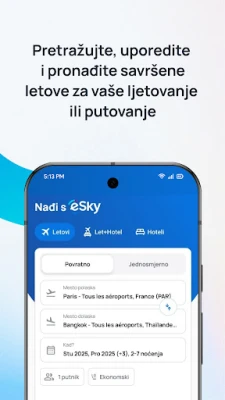 Uz eSky aplikaciju lako organiziraj cijelo putovanje! Pronađi jeftine avionske karte među 950 kompanija, rezerviraj smještaj ili Let+Hotel pakete s Garancijom Najniže Cijene. S eSkyjem je odmor iz snova jednostavno, brzo i povoljno.