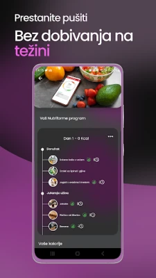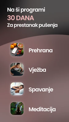 S Cig'Stopom dobivate sveobuhvatnu podršku prilagođenu vašim potrebama. Otključajte moć naših specijaliziranih programa: pronađite unutarnji mir uz 30-dnevni modul meditacije, održite idealnu tjelesnu težinu uz stručno osmišljene prehrambene i sportske planove, te osigurajte miran san kroz naš inovativni modul za analizu i podršku spavanju. Pratite značajna poboljšanja vašeg zdravlja i blagostanja koja se javljaju već od prvog dana bez cigarete, s pogledom na dugoročnu transformaciju.