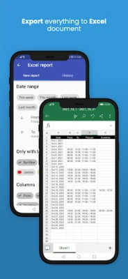 Dobijte jasan uvid u svoje financije i radne obrasce uz detaljne statistike i pregledne grafikone za mjesečne, tjedne ili prilagođene periode. Za male timove, aplikacija nudi efikasno praćenje radnog vremena zaposlenika, pojednostavljujući administraciju i osiguravajući preciznost. Vaši podaci su uvijek sigurni zahvaljujući automatskom sigurnosnom kopiranju u oblak i lako se dijele putem Dropboxa, e-pošte ili Google diska. Uz dodatak kalendara za brzu navigaciju i mogućnost izvoza prilagođenog datuma u Excel, imate potpunu kontrolu i fleksibilnost nad svojim podacima.